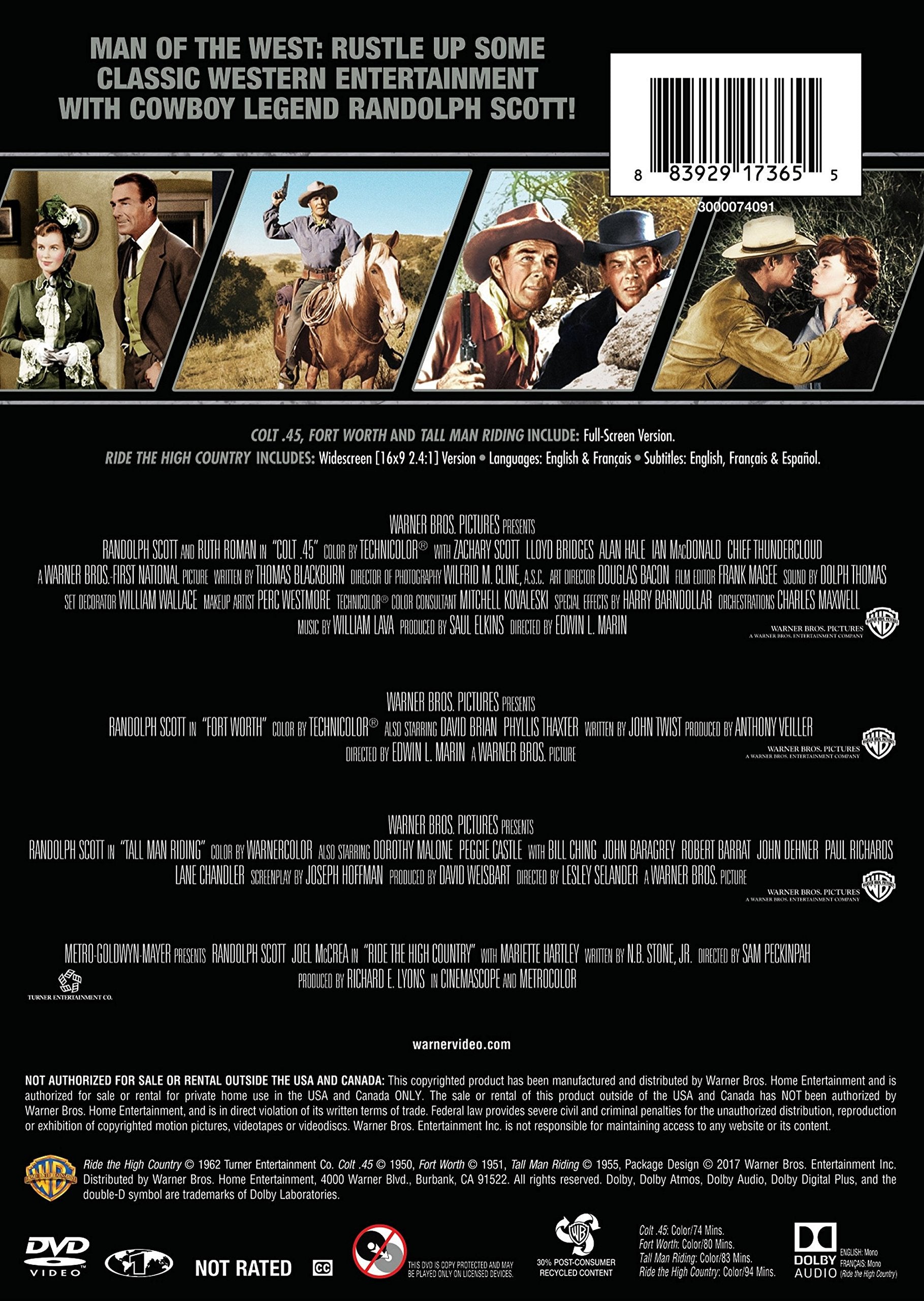 Details: Man of the West: rustle up some classic Western entertainment with cowboy legend Randolph Scott! 4 Films: Colt .45, Fort Worth, Tall Man Riding, Ride the High Country