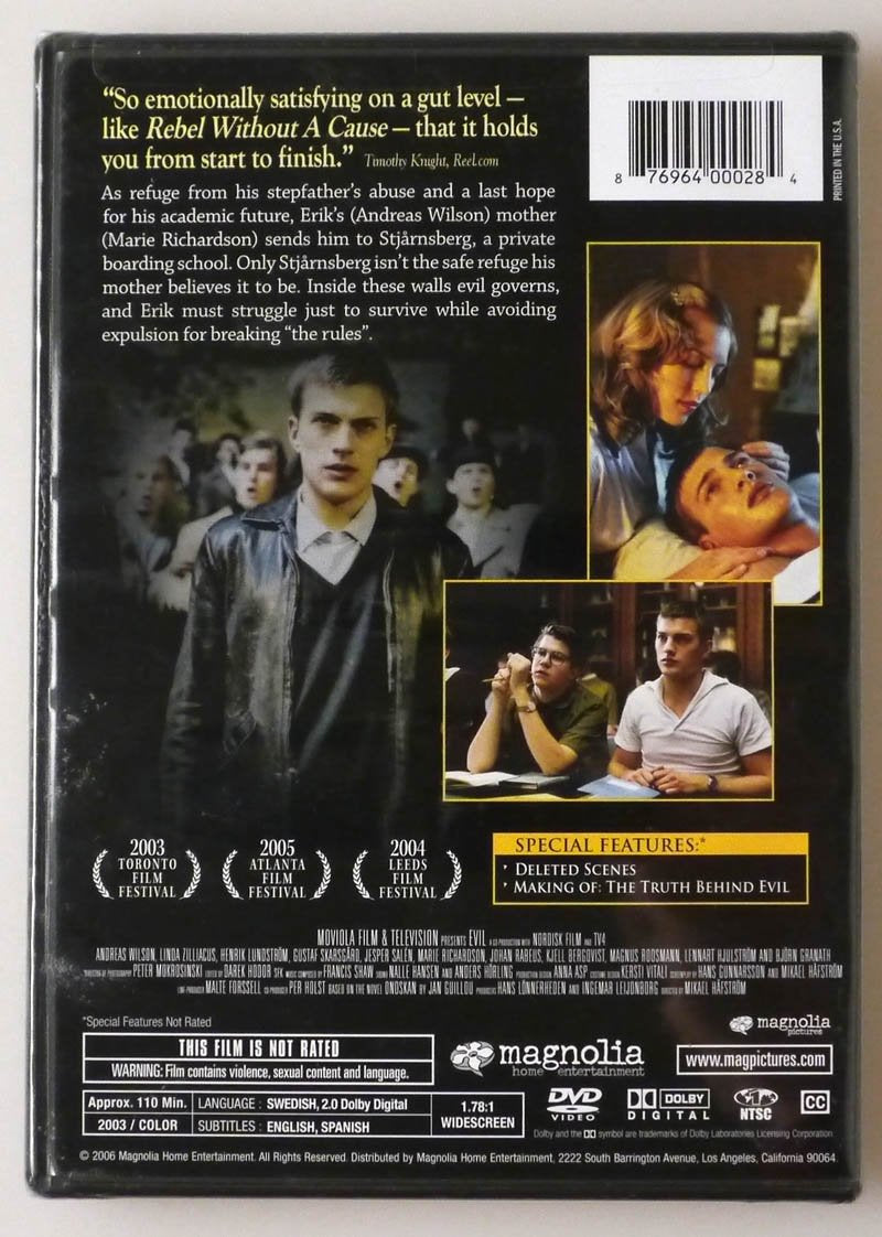 Based on the novel, Ondskan, by Swedish author Jan Guillou, Evil questions the very definition of the term by telling the story of Erik Ponti (Andreas Wilson), a high-schooler who confronts his violent past in order to overcome it. Directed by Mikael Håfström (Derailed), the film opens with Erik being expelled from high school for fighting, then being transferred to the militaristic academy, Stjärnsberg, as his last chance for graduation. Having been raised by a weak mother and an abusive stepfather, Erik's worldview is skewed by a sensitivity to injustice, so that when upper-classmen bully him and his best friend, Pierre Tanguy (Henrik Lundström), Erik is plagued by his desire to handle situations violently. Once Pierre teaches Erik about Gandhi, Erik quickly grasps the non-violent idea of mind over matter since he was forced to transcend physical pain as an abused child. However, when Erik does get his revenge on both his father and his schoolmates, his violence is justified. Evil sophisticatedly examines violence from the perspectives of its perpetrators and victims, showing how violence breeds violence. In learning how self-loathing begets violent behavior, protagonist Erik Ponti does much more than become a better person in the film. He becomes a living example of how an "evil" person can be multi-faceted, thus complicating an oversimplified concept of good versus evil. --Trinie Dalton