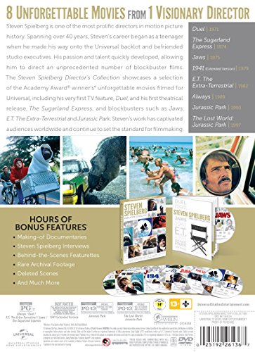 Details: Steven Spielberg is one of the most prolific directors in motion picture history. Spanning over 40 years, Steven's career began as a teenager when he made his way onto the Universal backlot and befriended studio executives. His passion and talent quickly developed, allowing him to direct an unprecedented number of blockbuster films. The Steven Spielberg Director's Collection showcases a selection of the Academy Award winner's unforgettable movies filmed for Universal, including his very first TV feature, Duel, and his first theatrical release, The Sugarland Express, and blockbusters such as Jaws, E.T. The Extra-Terrestrial and Jurassic Park. Steven's work has captivated audiences worldwide and continue to set the standard for filmmaking.