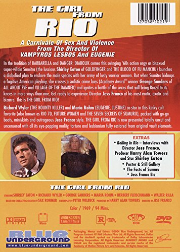 Details: In the tradition of Barbarella and Danger: Diabolik comes this swinging '60s action orgy as bisexual super-villain Sumitra (the luscious Shirley Eaton of Goldfinger and The Blood Of Fu Manchu) launches a diabolical plan to enslave the male species with her army of lusty warrior women. But when Sumitra kidnaps a fugitive American playboy, she crosses a sadistic crime boss (Academy Award winner George Sanders of All About Eve and Village Of The Damned) and ignites a battle of the sexes that will bring Brazil to its knees in more ways than one. Get ready to experience director Jess Franco at his most erotic, exotic and bizarre. This is The Girl From Rio!